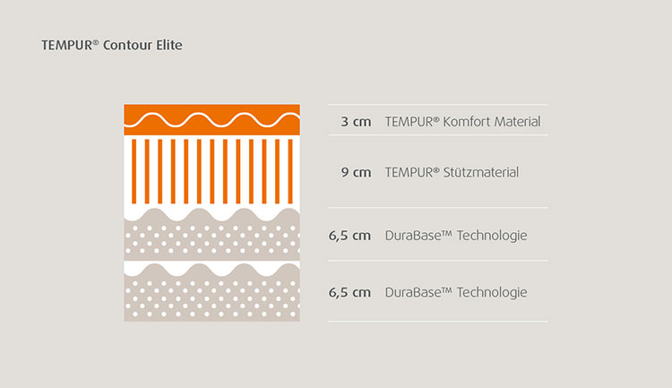 Durch den besonderen Schichtaufbau der Matratze und das traumhaft druckentlastende TEMPUR®-Material, wird Ihr Körper optimal gestützt. Das TEMPUR®-Material passt sich Ihrem Körper an und hilft Ihnen, Ihre persönliche bestmögliche Schlafposition zu finden. Die Matratze besteht aus zwei jeweils 6,5 cm dicken Schichten mit DuraBase™-Technologie als Basis und einer darauf gelegten 9 cm dicken TEMPUR®-Stützschicht. Eine zusätzliche 3 cm dicke TEMPUR®-Komfortschicht sorgt für einen besonderen Komfort und angenehmen Schlaf.
