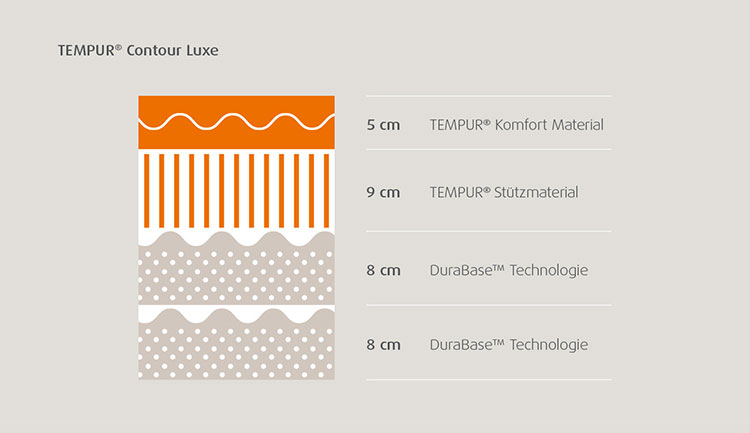 Durch den besonderen Schichtaufbau der Matratze und das traumhaft druckentlastende TEMPUR®-Material, wird Ihr Körper optimal gestützt. Das TEMPUR®-Material passt sich Ihrem Körper an und hilft Ihnen, Ihre persönliche bestmögliche Schlafposition zu finden. Die Matratze besteht aus zwei jeweils 8 cm dicken Schichten mit DuraBase™-Technologie als Basis und einer darauf gelegten 9 cm dicken TEMPUR®-Stützschicht. Eine zusätzliche 5 cm dicke TEMPUR®-Komfortschicht sorgt für einen besonderen Komfort und angenehmen Schlaf.